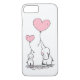 Bela mãe de desenho animado e elefante bebê segurando balões rosas em forma de coração em seus troncos.