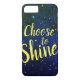 Uma caneca distante com um fundo estrelado e a palavra "Escolher brilhar" em um script amarelo.