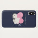 Capa de telefone personalizada com uma ilustração gráfica adorável. Uma gatinha branca com uma bela imagem impressa no pelo. Dormindo em paz. Um grande coração rosa atrás dela e algumas estrelas pequenas também. Fundo azul escuro.