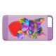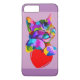 Uma capa de telefone vibrante com uma ilustração colorida e estilizada de um gato com uma expressão lúdica. O gato, rendido num espectro de matizes brilhantes, parece se enfiar contra um grande coração vermelho. O fundo é uma lavanda macia que melhora o gato.