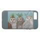 Coruja de celeiro, coruja barrada e coruja nevado com chapéus verdes