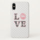 Características deste design um grupo pastel de lábios e de AMOR em um teste padrão listrado preto e branco.