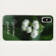 Foto de Zolotareva. Que lírios brancos do vale estão crescendo para mim na floresta. O lírio do vale cresce em pinheiro e pinheiro caduco e também nas florestas mistas, nas bordas e glades. Pequenas flores brancas de um lírio do vale. Flores Lily das folhas verdes do vale. Você pode adicionar nome ou texto personalizado. Personalize esta modelo.