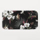 Uma design de capa de telefone vibrante com um fundo preto rico adornada com flores e folhas tropicais exuberantes. A composição apresenta florescências brancas com detalhes intrincados, complementados por folhagem verde profunda e burgata.