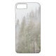 Toque na época de férias com a estética aconchegante de pinheiros nebulosos contra um céu branco de inverno.