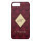 Um design elegante e chico com um fundo luxuoso vermelho-escuro tufado com divés dourados e um diamante dourado com seu monograma e nome em tipografia elegante de escrita. Faça uma declaração com esta capas de iphone vermelha e dourada minimalista.