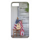 guitarra e bandeira americana em cadeira de madeira pela porta rustica frontal