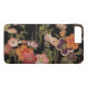 Padrão floral oriental tradicional em rosa, laranja e roxo contra um fundo preto.