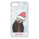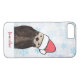 Uma capa de telefone personalizada com uma fotografia natural de uma lontra fofa segurando o rosto nas patas. Vestindo um chapéu de natal vermelho desenhado à mão. Um padrão de fundo em flocos de neve.