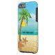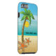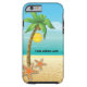 Palmeira e paisagem tropical de estrelas-do-mar, caso do iPhone 6, apresentando uma paisagem tropical: uma palmeira com coco numa praia arenosa com estrelas-vivas, mar azul/oceano e céu com sol e nuvens. É um modelo e você pode alterar seu texto ou excluí-lo.
