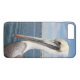 Pelicano pacífico cinzento com céu azul e água no fundo.