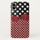 Maleta divertida para iPhone X bolinhas, com gráficos de um padrão de bolinhas preto e branco, na parte superior do gabinete, e um vermelho com bolinhas brancas, na parte inferior. Uma fita vermelha e um arco, com um sotaque de botão preto, decoram o meio do gabinete. Personalize este caso bonito para adicionar qualquer texto desejado.