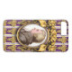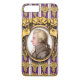 As ilustrações e design originais por ZoeSPEAK neste Case de iPhone 8/7 Plus apresentam um retrato do compositor de música clássica Wolfgang Amadeus Mozart. O retrato é um perfil colocado em uma moldura dourada oval ornamentada. A moldura está pendurada em um fundo de papel de parede roxo com cachos dourados de uvas em fileiras e listras verticais brancas e lavanda.