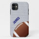 Casos de fãs de futebol americano, iPhone 5, com gráficos de uma camisola de cinzas, parecem fundo. Gráficos de um futebol decoram o canto inferior direito do gabinete e o texto de cor azul personalizado, no lado esquerdo, está pronto para personalizar. capa de telefone de Excelente para o fã ou jogador de futebol.