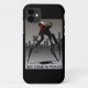 Design de ficção científica apresentando uma ilustração de uma máquina de guerra tripé gigante da alienígena, com uma silhueta de horizonte urbano ao fundo.