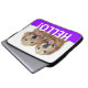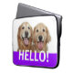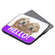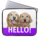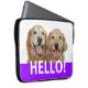 Diga olá!!  Esta bolsa de laptop caracteriza uma fotografia de dois cães de sorriso do golden retriever, com a palavra OLÁ!! em um fundo roxo.