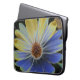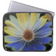 Esta bolsa de laptop incrível apresenta uma fotografia lindamente detalhada de uma flor margarida africana. A foto foi alterada digitalmente, resultando em uma flor com metade de suas pétalas azul e metade delas ouro amarela.