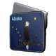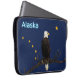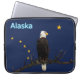 Uma águia careca varreu o céu de sua perca em um galho de árvore; sobreposto a uma bandeira do Alasca. A leitura de texto "Alaska" também aparece em azul e branco brilhantes.