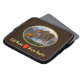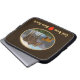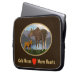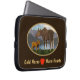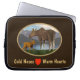 Um alce e seu bezerro bonitinho com um lago e montanhas à distância. O slogan "Noses frias (Um coração vermelho) Corações quentes" também aparece.