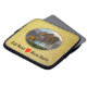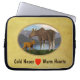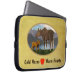 Um alce e seu bezerro bonitinho com um lago e montanhas à distância. O slogan "Noses frias (Um coração vermelho) Corações quentes" também aparece. Tudo sobreposto a um fundo de couro braintan.