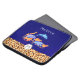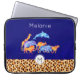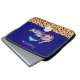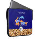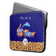 Bolsa de laptop projetada com uma borda de impressão leopardo laranja exótica ao longo da parte inferior. Ilustrado com uma imagem de aquarela digital de um rebanho de animais selvagens que corra juntos. Os animais incluem golfinhos saltadores, girafa, elefante, canguru, rinoceronte, leão e leopardo. O fundo é uma cor púrpura azulada.