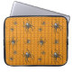 Um fundo laranja brilhante cria uma base perfeitamente temática no Halloween para um padrão repetido de teia negra rastejando com aranhas. Essas aranhas, modeladas após a falsa viúva, apresentam um crânio branco brilhante em seus abdômen e outras marcas brancas em seu corpo e pernas. Esta capa está disponível em tamanhos de 10", 13" e 15" para ajustado de uma variedade de laptop, netbooks e tablets.
