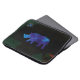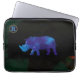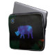 Design de silhueta de rinoceronte azul e roxo em fundo abstrato preto, com letra inicial "R" dentro a círculo preto - zoológico legal por zstore mundial misturado