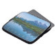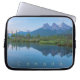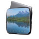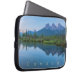 Uma paisagem serena com a cordilheira das Três Irmãs refletida num corpo calmo de água. O céu é um gradiente macio de azul e rosa, indicando o nascer do sol ou o pôr do sol. Todas as árvores verdes alinham a costa, acrescentando profundidade à cena. A superfície da água é lisa, criando uma imagem quase perfeita das montanhas e do céu.