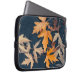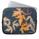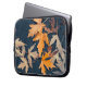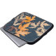 Uma fotografia de aproximação captura uma coleção de folhas caídas do outono flutuando numa superfície de água azul escura. As folhas são uma mistura de tons vibrantes, laranja, amarelo e marrom, com alguns sinais de decaimento. As folhas são dispostas em um padrão aparentemente aleatório, criando uma composição visualmente atraente.