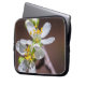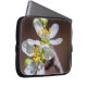 Uma fotografia de proximidade captura a delicada beleza das flores de ameixa. A flor, com suas cinco pétalas, está em flor de cheio, mostrando seu centro amarelo brilhante com numerosos estames. As pétalas são moles e translúcidas, com uma sutil bainha. A flor está presa a um galho fino, com fundo desfocado de matizes castanhos e verdes.