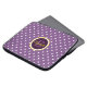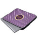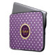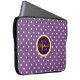 Esta bolsa de laptop roxa moderna apresenta um padrão branco de bolinhas fofa e um nome e monograma personalizáveis em amarelo e roxo.