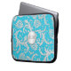Esta brilhante bolsa de laptop azul aqua e prateada floral damask tem um medalhão de prata FAUX com uma caixa de texto para você adicionar seu próprio nome, monograma ou outro texto. Se precisar de ajuda para personalizar, envie um email para niteowlstudio@gmail.com.