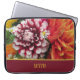 Esta bolsa de laptop apresenta dahlias laranja e burgundy vívidas, bem como um bloco de cor burgundy contrastante com as suas iniciais em laranja ouro. Digite suas iniciais no espaço fornecido para uma bolsa de laptop personalizada.