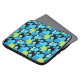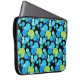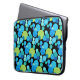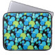 Uma manga de cor vibrante para proteger o seu laptop (15" ou menor), com um padrão de abstrato de "Luas Azuis" em azul brilhante e verde neon em fundo preto; de um design de colagem de papel pintado à mão por Judy Adamson.