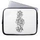 Uma bolsa de laptop de 10 polegadas com trabalho de arte por montagem. O trabalho de arte retrata uma clave coberta de videiras e flores.