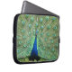 Pavão orgulhoso espalhando suas penas verdes e azuis na cauda através do cobrir desta bolsa. Penas azuis profundas pegam o olho.