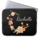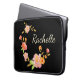 Bolsa de laptop com fundo preto com flores cor-de-rosa laranja e verde e um monograma de nome personalizado