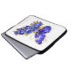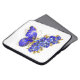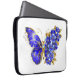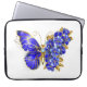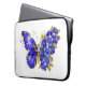 Borboleta de flores cinza, azul, safira, espumante com asa decorada com flores preciosos azuis com folhas de ouro sobre fundo branco.