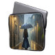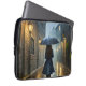Mulher de trás, com guarda-chuva na chuva em um beco velho, à noite com velhas luzes de rua brilhantes