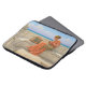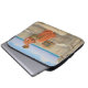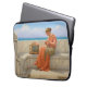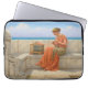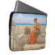 A bolsa de laptop apresenta a pintura "Canções Sem Palavras" (1918) de John William Godward. Este trabalho de arte clássico, de cor clara, apresenta uma mulher segurando uma flauta em um banco ao lado de um pássaro enjaulado com um fundo oceânico. Principalmente tons de laranja, azul e marrom.