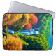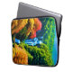 Uma serena cascata chinesa aninhada em meio à bela natureza, cercada por árvores e montanhas coloridas.