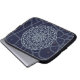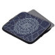 Uma mandala concêntrica, tipo rendas, em azul-claro, com pontos azuis brilhantes e dourados, girados entre as camadas, faz um design divertido, que traz à mente um céu noturno estrelado.