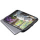 Relaxing and colorful tablet case featuring a white fluffy cat napping on a rustic window sill next to a pretty vase of vibrant purple flowers.
