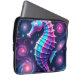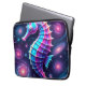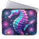 Esta design apresenta um colorido e vibrante cavalo de mar roxo contra um pano de fundo galáctico.