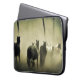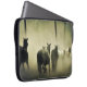 Imagem majestosa de cavalos selvagens correndo através de uma floresta nebulosa.