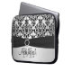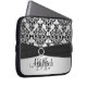Esta cinza personalizada e bolsa de laptop de damasco preto com fita FAUX e broche de joia tem caixas de texto para você personalizar com seu próprio nome, monogramas, nome comercial ou outro texto. Se precisar de ajuda para personalizar, envie um email para niteowlstudio@gmail.com.