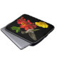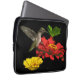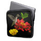 Esta bolsa de laptop caracteriza um colibri rubi-throated fêmea. Paira no ar ao beber o néctar do centro dourado de uma flor vermelha brilhante do zinnia. Uma flor amarela do zinnia é próxima e algumas folhas do verde terminam a composição. As cores parecem incandescer contra o fundo preto.