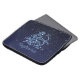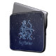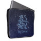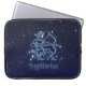 Bolsa de laptop com símbolo Sagitário em azul-prata-mole, sobreposta com as estrelas da constelação, contra fundo de céu estrelado formando de azul-da-noite profundo a preto