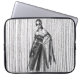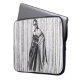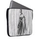 Esta é uma ilustração na moda a preto-e-branco que apresenta uma mulher envenenada num vestido dramático, fora do ombro, com embelezamentos florais intrincados e uma capa brilhante e fluente. O fundo tem uma textura vertical impressionante, acrescentando uma sensação de profundidade e movimento