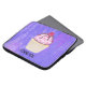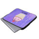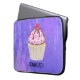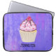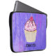 Uma bolsa de laptop com uma ilustração de um cupcake delicioso. Glacé rosa e garoa de chocolate. Um cupcake amarelo e uma framboesa no topo. Meu Deus! O fundo é uma textura de abstrato púrpura com pequenos corações espalhados.